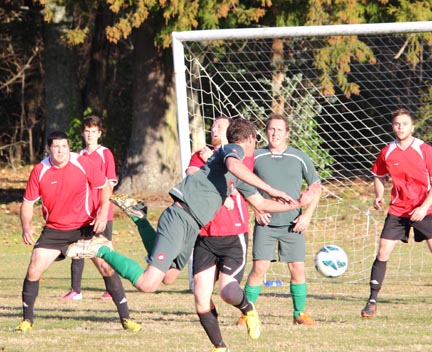 Grahame has an acrobatic header in the Kawerau area. Matt Dalgity