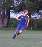 | Ryan comes in to take the penalty. In his own cheeky style, Ryan takes it with his left foot even though he is right footed! He scores goal 21 for the season. | Jase runs the ball up from right back. Surely no 7 isn't intimidated by Jason's size, is he? |