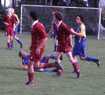 | Not a good day in defence. Bazza, Dutchie and Chopper look rather nervous. | Cuse performs a quick turn to race his opponent to the ball. Ryan (11) watches with interest. |