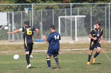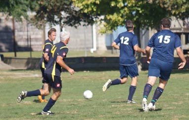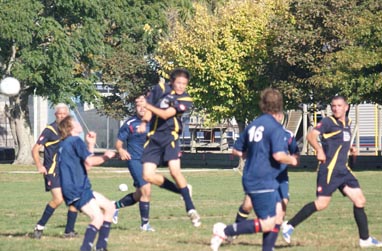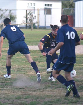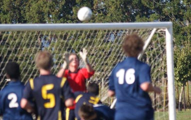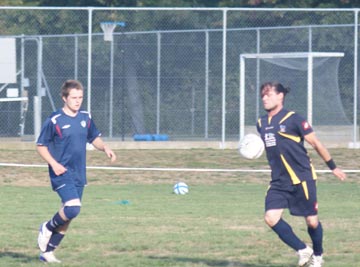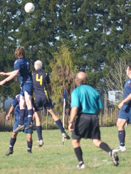 Kirk, playing sweeper, chests the ball down before clearing it.