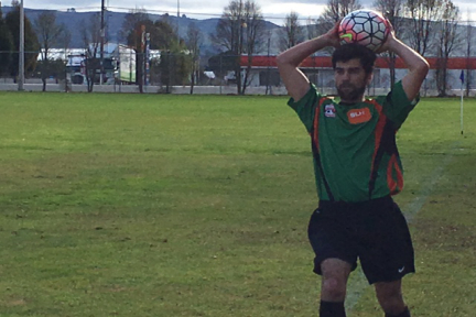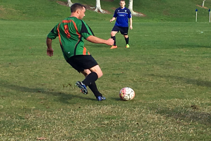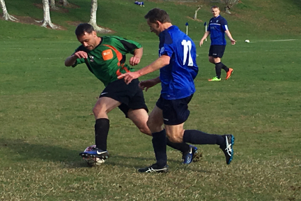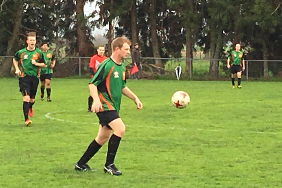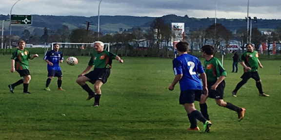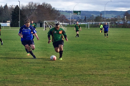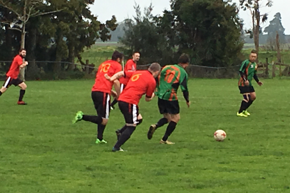 Now we're in Rotorua, with quite a different line-up. Barrie Hawkes is playing centre back with Aaron Muggeridge. Bazza (POD) chips the ball forward. Jacob Heath is closest at left back. Carl was the only defender left from last week, out on the right! |