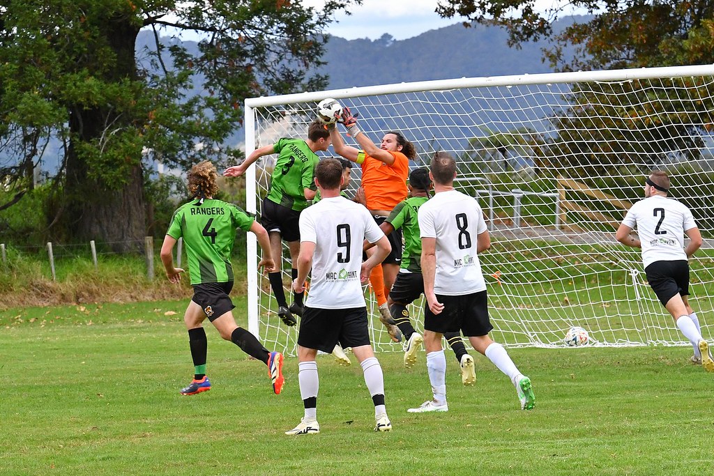 | Whakatane keeper Reuben Whittaker takes the ball off the noses of the Rangers strikers Joe & Sione |